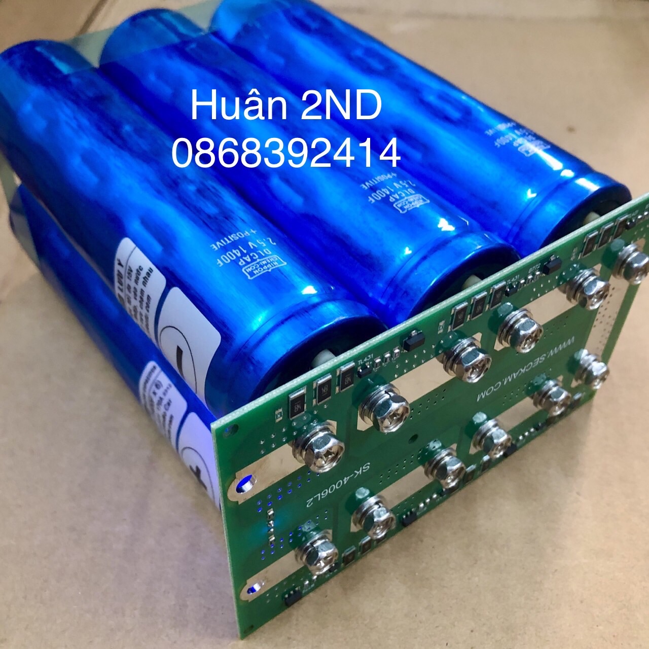 Siêu tụ điện 1400F 2.5V của Nhật, nhãn hiệu Nippon-Chemi-con hàng tháo máy công nghiệp mới trên 90%. Nối tiếp 6 siêu tụ trên mạch cân bằng điện áp thành khối Siêu tụ điện 12V-15V/230F xả tức thời 150-170A có thể sử dụng đấu song song với acquy để gánh tải ăcuy đề mượt những xe có dòng khởi động lớn, xe máy dầu, xe độ đèn pha công suất lớn.